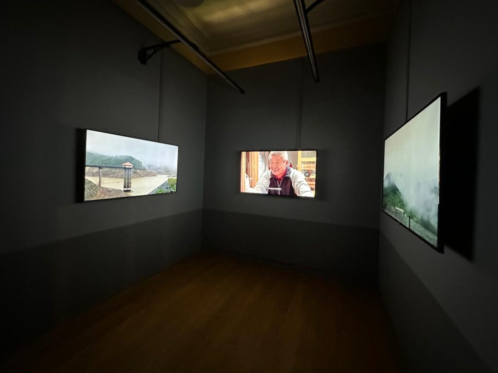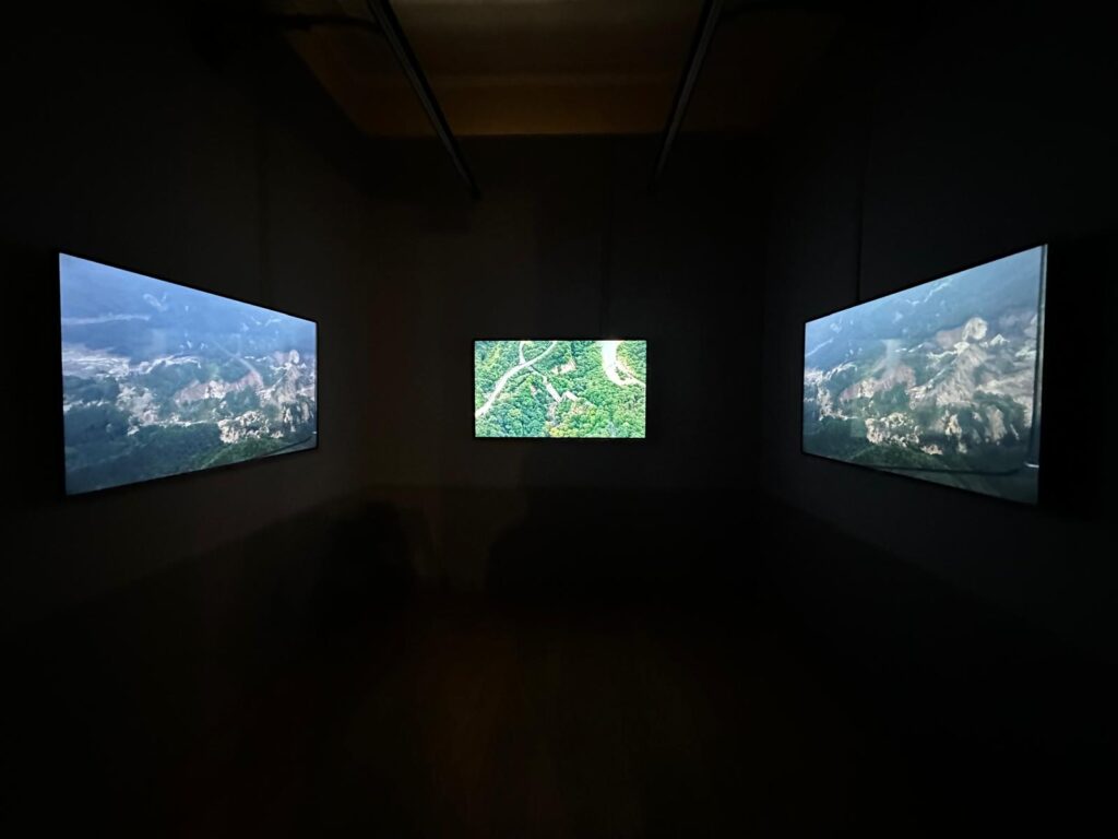 “What is affirmed in e —is the attraction to a form of narrative that would combine speech with characters and landscapes. In the case of e, three phases of this narrative are played out: before the catastrophe, which contains an element of insouciance, the suspended time where “it” happens, which is a paradoxical subjective time because the few seconds of the earthquake are experienced as an eternity by those who live through it, and afterwards, which is a time that bears the visible or invisible stigmata of the event and must be redefined, reinvented. The linearity of this story in three phases is only a surface effect, an abstract construction that can occur only with an external or remote distance, like that of the witness, the stranger, or with adequate temporal distance. It’s an effect of perspective, that is to say, a construction of the narrative where the vanishing lines and axes can come together at one or several points, and something of the diffraction or break can then be reconstructed. The installation set-up with three simultaneous screens demands that the viewer grasp multiple meanings: they must choose and associate the elements of a subjective montage in a threshold situation. The inherent incompleteness of the set-up is associated with enveloping elements such as sound, mixing natural ambiences, with strident birds and insects, and deep, almost tellurian frequencies. The movement of withdrawal in relation to the incompleteness of meaning is offset by other elements of the language of forms and sounds.” Marta Gili, Interview with Natacha Nisic, in Echo, Catalogue of the Jeu de Paume, Actes Sud, 2014