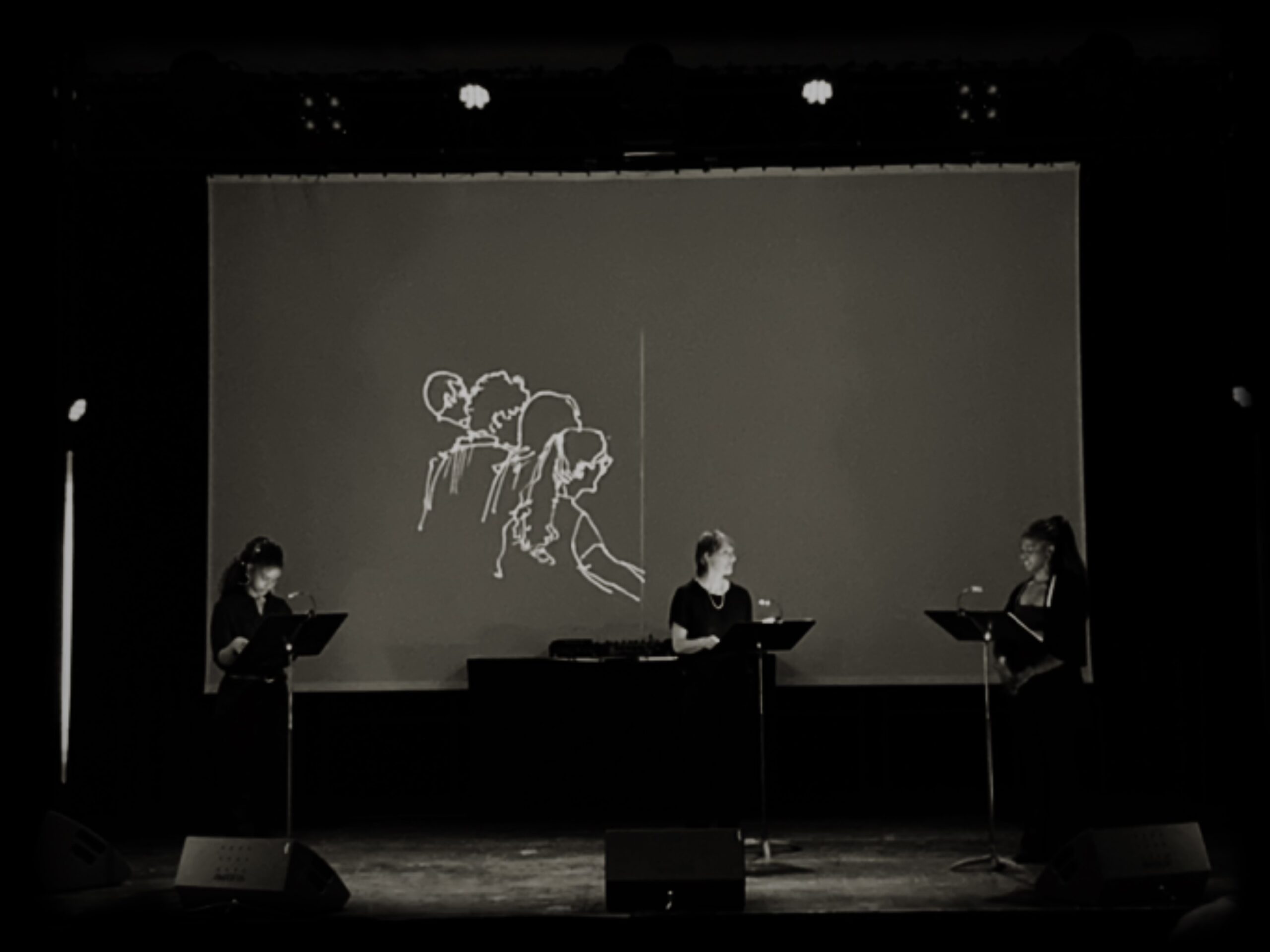 The performance consists of retelling the entire trial of Tito Baharira and Octavien Ngenzi in a three-voice reading, with the successive roles of the judge, the executioners, and the witnesses. On stage, for 45 minutes, supported by drawings of the trial, the intensity of the debates brings out the violence contained in the words, between denial and contradictory testimonies, in search of the truth.