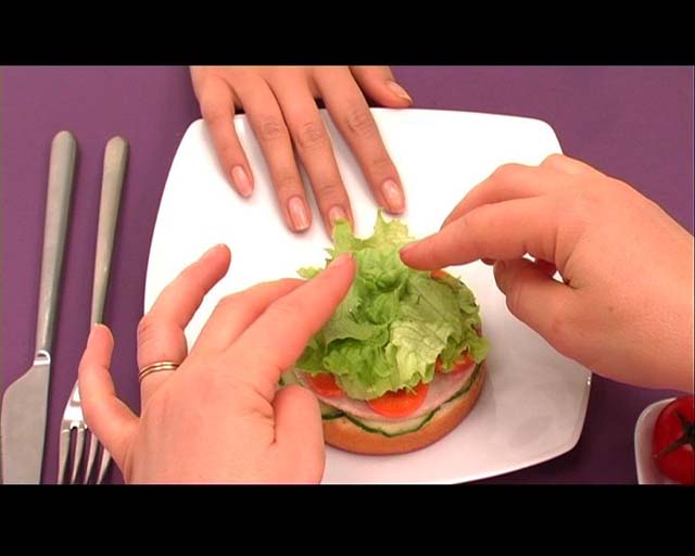 The scene follows the continuum of an advertising shot for a new, healthy, natural, low-calorie hamburger; a pure, almost cosmetic model. What is visible is the before and after of the staging around the making of this photograph. All the gestures are those of the professionals involved in this shoot: the chef-decorator, the make-up artist, the food preparer. This millimetric and choreographic set-up is articulated around the figure of the hand detail model, the main character of this scene and the driving force behind the whole movement. It is a long movement of nearly five minutes from the confined, intimate dressing room where the make-up is done, through the dark corridors of the studio, and towards the central stage, lit by a bright, spread-out light, a “pure” light like the advertising cliché. Each gesture is captured in close-up, dissected to become a choreography. Repetitive, unconscious and practical gestures, they belong to the vocabulary of human behaviour that intrigues Natacha Nisic.