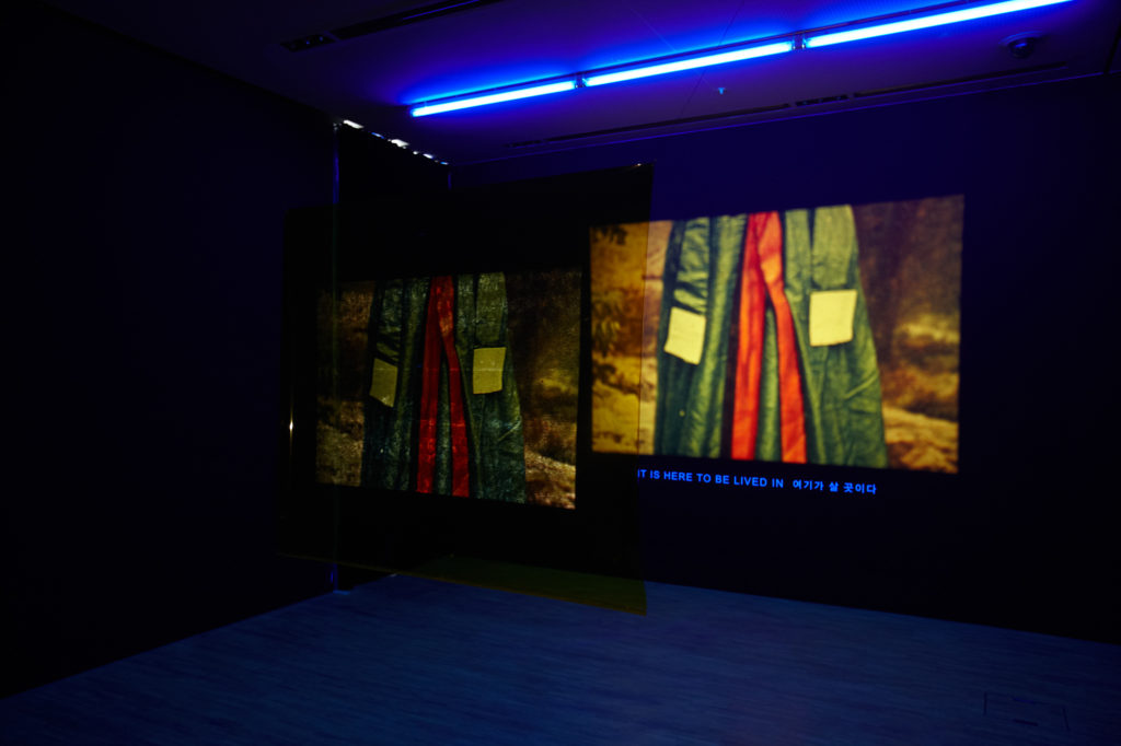 Natacha Nisic and Park Chan-kyong, Cropping the “Im Lande der Moregenstille”, slide projection, installation, 2012