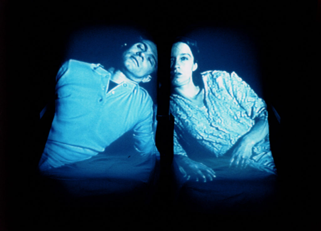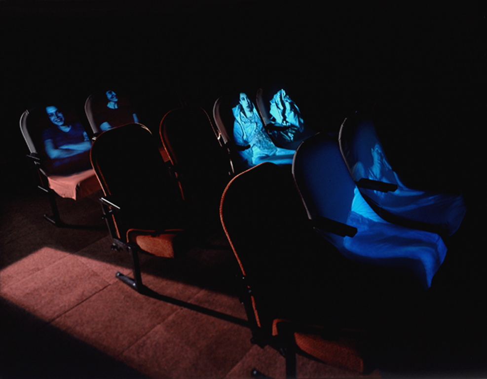 The bodies of the spectators are projected on cinema seats and a surveillance camera films the entire scene.It is the second piece of the serie “Attitudes”.