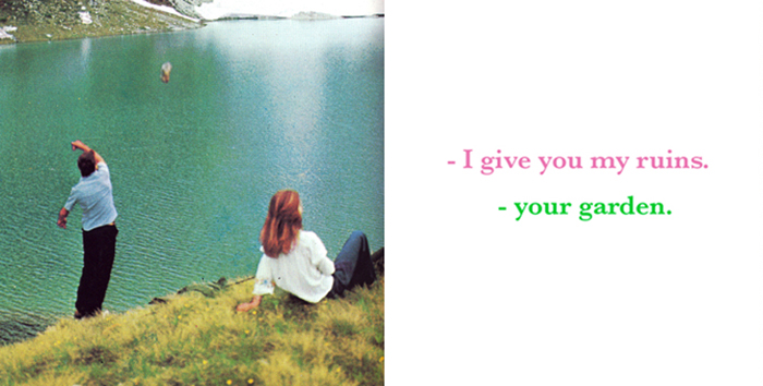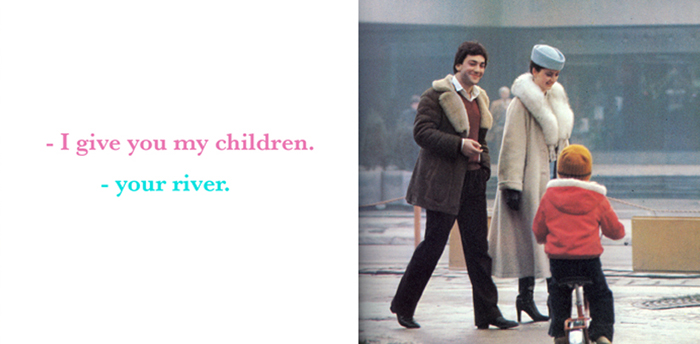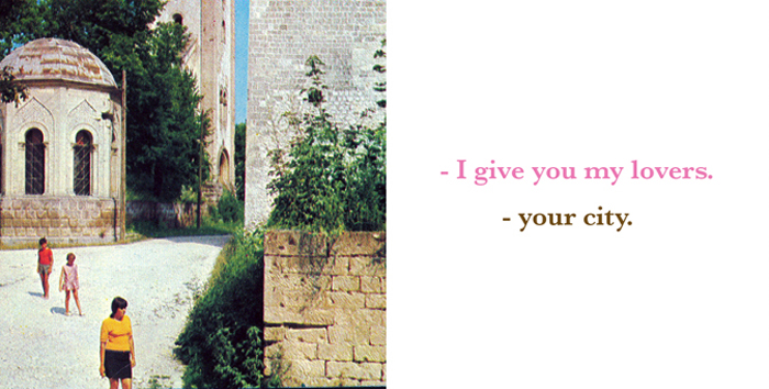 Drawing an horizontal line on the building of the Cultural Center in Belgrade, this Text and Image fresco sets an impossible dialogue between nostalgical images of Bosnia-Herzegovina and a contemporary voice questioning what remains from war times.