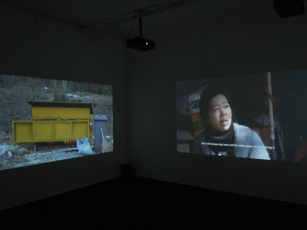By confronting different perspectives on geographical or spiritual territories, Natacha Nisic presents a fragmented view of contemporary Korea. The legacy of different eras lies close together, from the tradition of shamanism to the late aftermath of the Cold War.